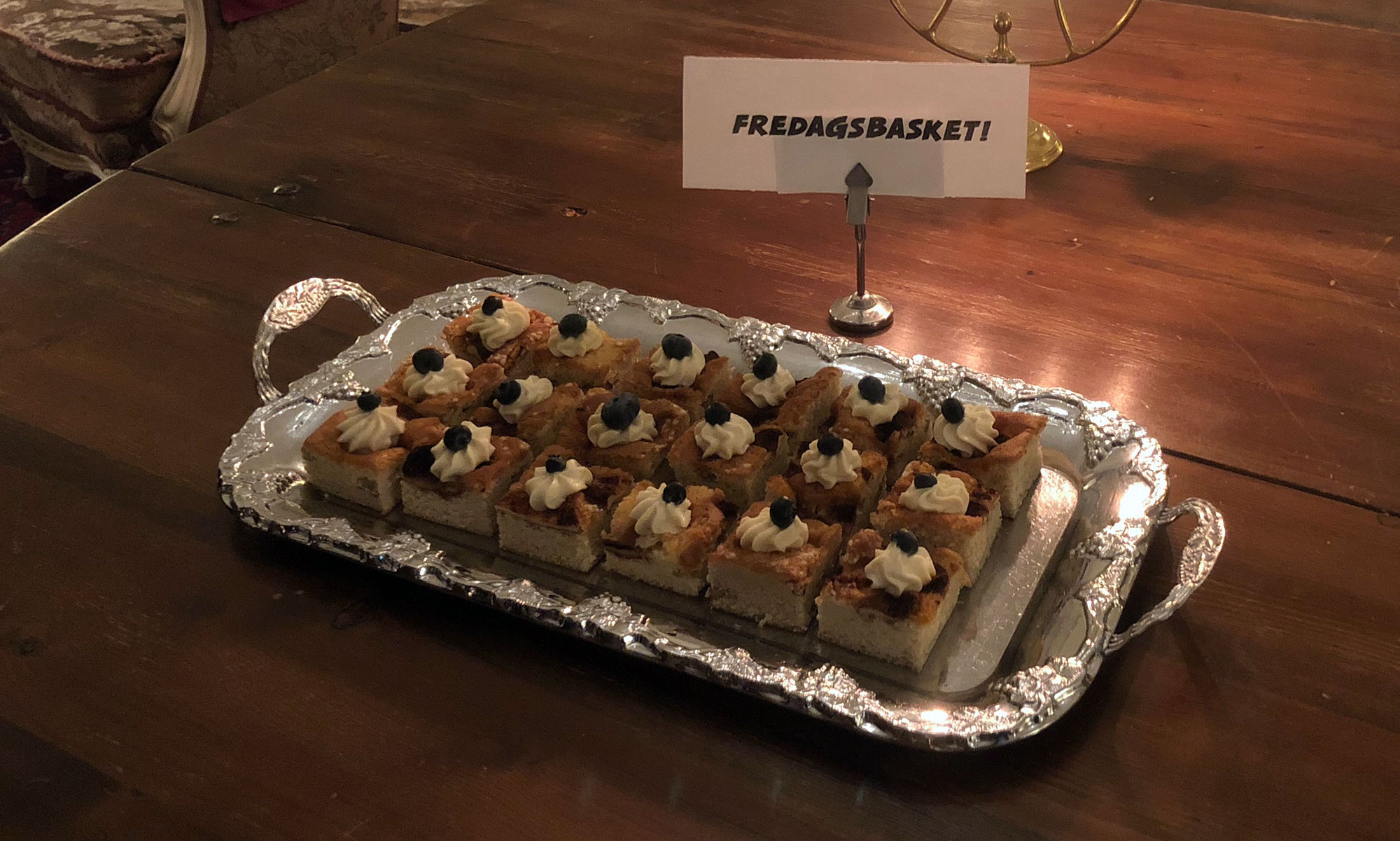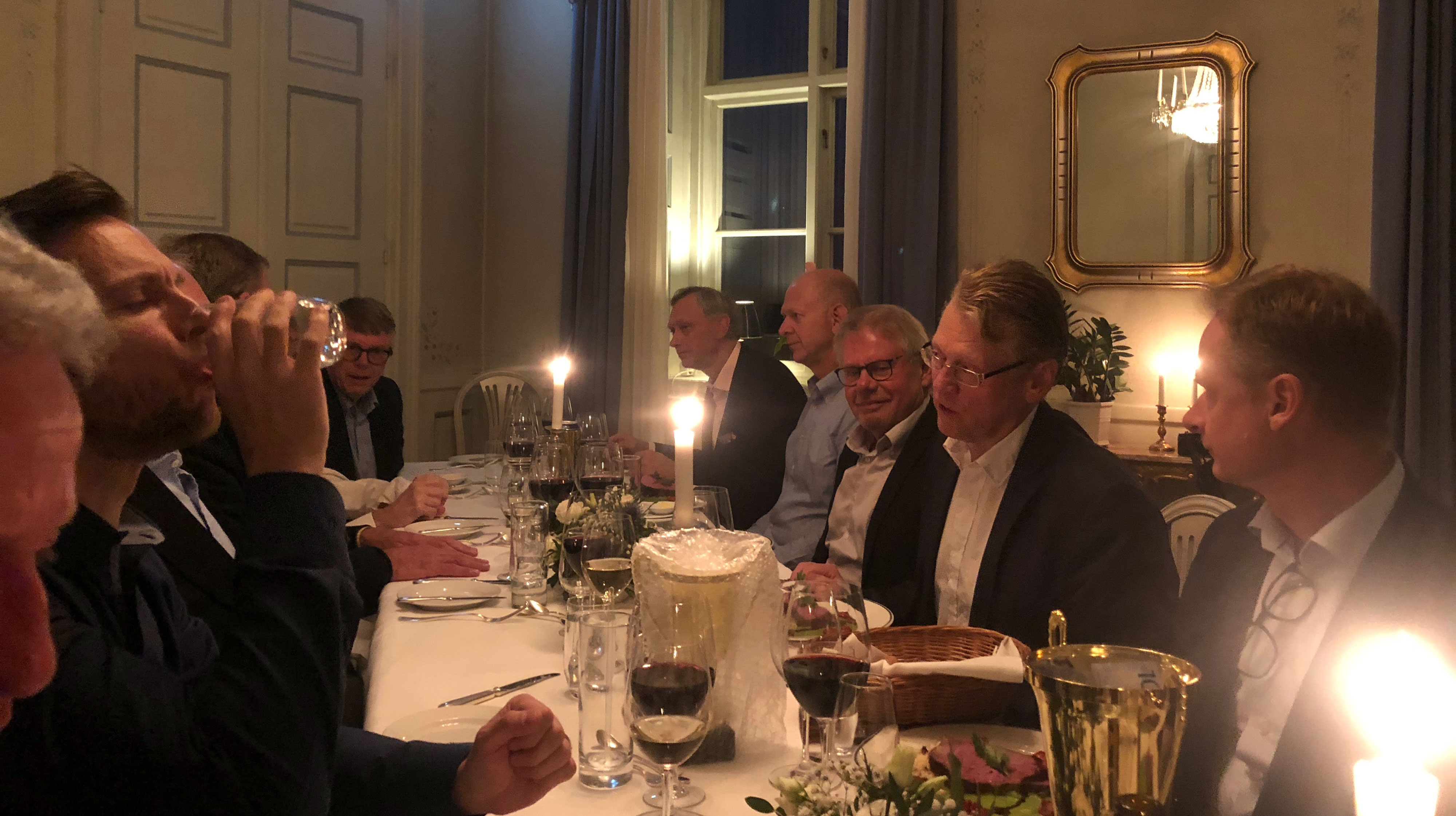 Välkomstdrinken, ett glas bubbel som sköljdes ner med en GT, avbröts endast av en fin historielektion där vi fick lära oss att Haga slott nog inte hade några vidare anor, men trots det var ett typiskt resonansslott (troligen en felsägning, skulle troligen vara nyresonans) och att ingen mindre än Nicodemus Dressin d.ä. höll i pennan. Och vips, proveniens*, så skapas en myt! Ledningen tillhandahöll facit för de som inte la allt på minnet. Efter historielektionen blev det gåsmarch upp till vårt chambre separé, diagonaldukat på typiskt nyresonansmanér. Men före desserten fick vi iallafall rätt rätt som förrätt, nämligen en grillad (nåja) aubergine med nåt på. (va fan var det på? Glömde det, men det var gott!) Jovisstja! Västerbottenpaj! Kall som bottenhavet, men saltigt mysig i gommen när den tinat lite. Till förrätt alltså. Till det konstigt utlösta japanska vinet serverades en glass med sabayonne (ver det lakrits?) Urgott!!! Under middagen hölls spirtuella tal och ett stort antal pokaler och priser delades ut: Mellanstor pokal gick till bäste värvare, Björn, som jobbat hårt med det germanska arvet. Mellanstor pokal gick också till Sektledaren Johan Wikner ”som bäste lagdelare samt strävsamt och tålmodigt deltagande varje fredag”. Stor pokal tilldelades till hr. Andraé som “bäste betalare”. Betalat 4 gånger och fick en kickback i form av otummade sedlar, levererade i den stora pokalen. Till de minnesvärda traditionella talen hörde åldermannens, som vi försöker komma ihåg. Efter sedvanligt toalettbesök samlades vi till kaffe med avec i de fina salongerna med skinnsoffor och trevligt sällskap, väldigt mysigt! Morgonen nalkades och vi samlades till en fantastisk Slottsfrukost, där allt man kan önska sig en fin morgon, serverades! Underbart! Rummen återlämnades och vi äntrade bilarna som åkte i konvoj mot ett okänt mål som så småningom visade sig vara 1992 års kickoffplats; Fagerudd! Piffi visar