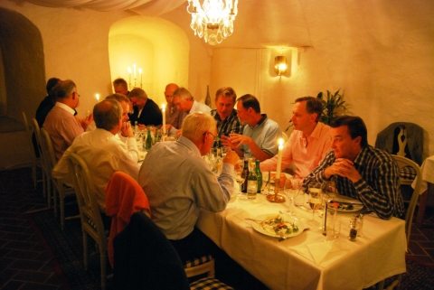 Middagen var alldeles utsökt, bestående av såväl för- huvud- och efterrätt, ackompanjerad av ett helt batteri goda viner, avnjöts i en parabelformad valvslagen stenkrypta.