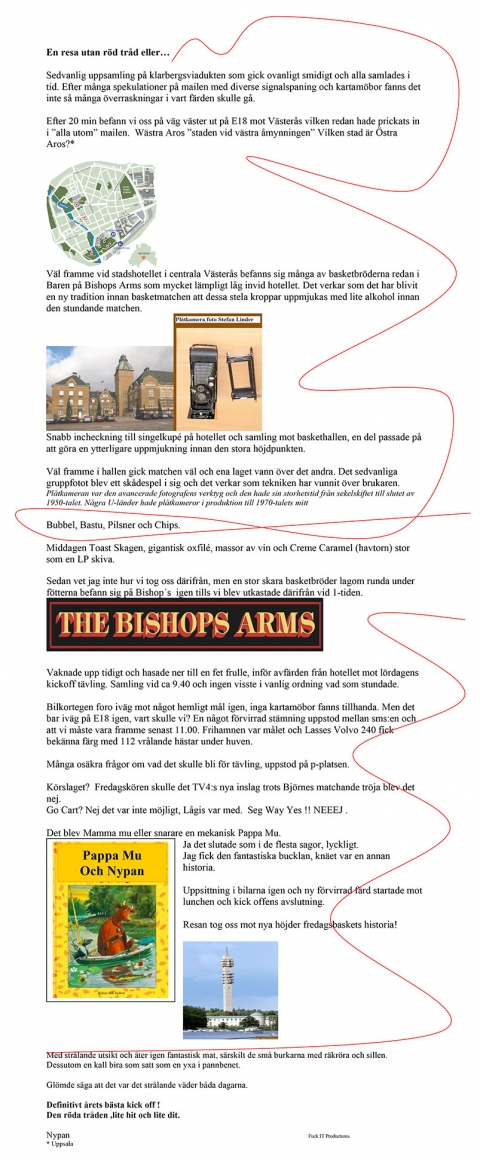 40 års jubileumskickoff. 3-6 september 2015. Tävling: MedlemsQuiz 2014 Norrtälje Kenneth Isevik & Lasse Petters Tävling: Bilracing 2013 Västerås Johan Sandberg & Johan "reserven" Wikner Tävling: Tjurhästen Golfmästerskapen 2009 Berlin, Wedding Peter W & Anders N Tävling: Basket Golfmästerskapen Läs matchskönikan här: http://www.fredagsbasket.se/index.php?s=7,1&det=415 Skrönikan2008 Södertälje, Hjorthagen Johan W & Björn J